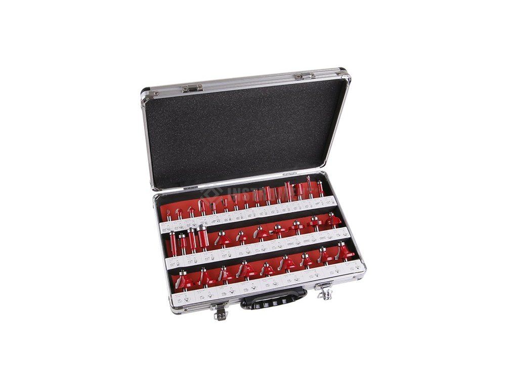 Sada tvarových fréz na drevo, rôzne druhy bez alebo s vodiacim kolieskom a kvalitným ložiskom, pre frézovanie drážok a hrán rôznych tvarov. Frézy sú osadené kvalitnými SK plátky. Priemer stopky 8mm. Odolný hliníkový kufor s označením výsledných tvarov drážok-hrán jednitlivých fréz.