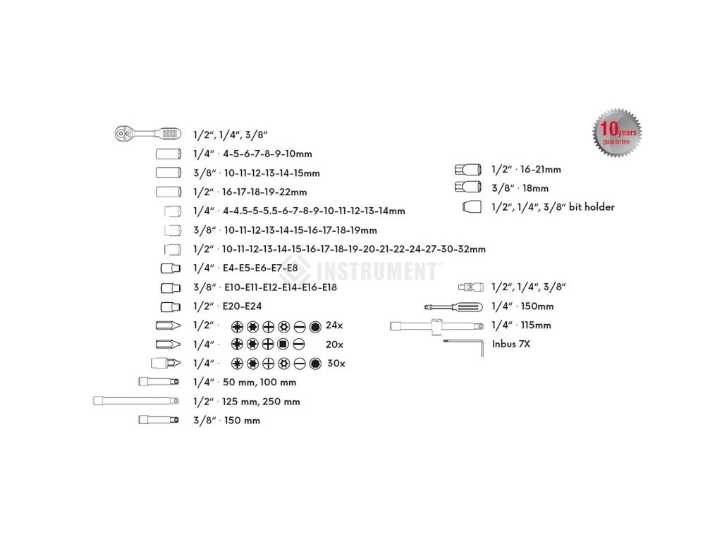 Sada hlavíc a nástavcov 1 / 4,3 / 8,1 / 2. Všetky časti sú vyrobené z chróm-vanádiovej ocele kovaním, dobre kombinovaná sada v prehľadnom plastovom kufri, račne s prepínací páčkou a uvoľňovacím tlačidlom, ergonomicky tvarovaná rukoväť.