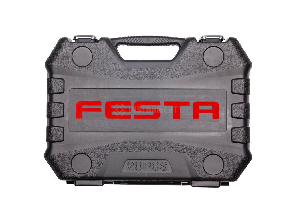 Gola sada 20ks 1/2" Festa CrV. Kvalitná gola sada je vhodná vďaka kvalite použitých materiálov a spracovanie v profesionálnej autodielni alebo servisu. 10 rokov záruka. Všetky časti sú vyrobené z vysoko kvalitnej chróm-vanádiovej ocele. Niklová povrchová úprava. Hroty bitov sú zo zliatiny ocele S2. Račne majú jemné delenie 72 zubov, telo račne z CrV ocele, zubový mechanizmus z S2 ocele, ergonomicky tvarovanú rukoväť so zdravotnej nezávadnej gumy. Nový dizajn plastového kufra z primárneho materiálu s kovovými uzávermi a pánty veka.