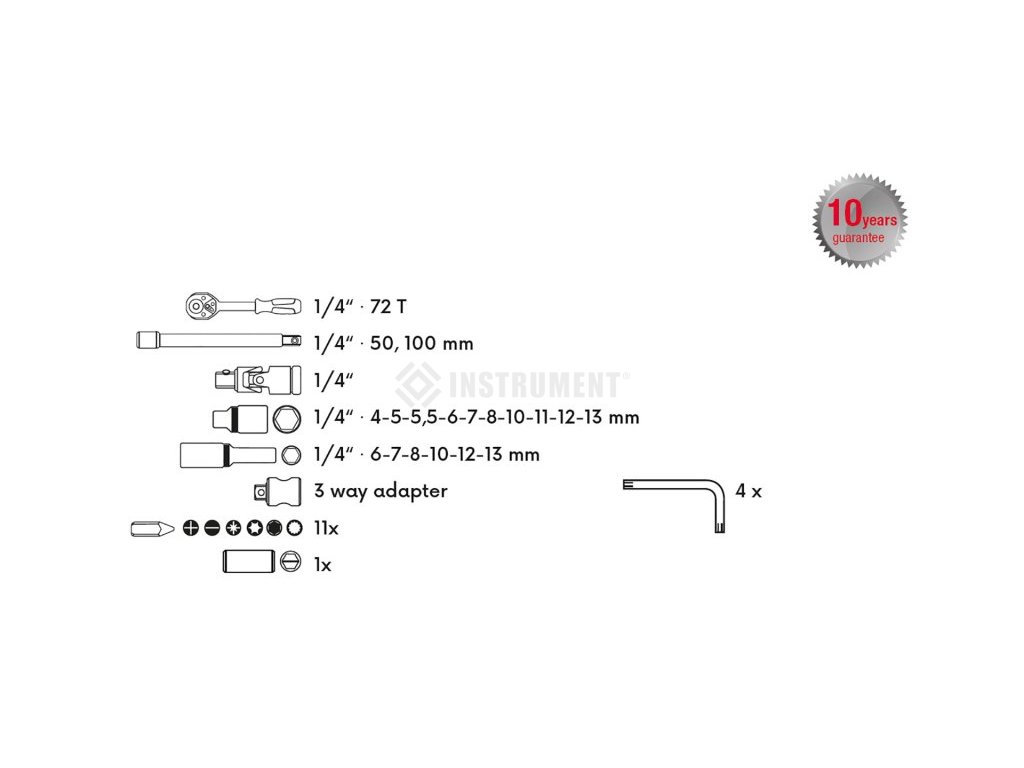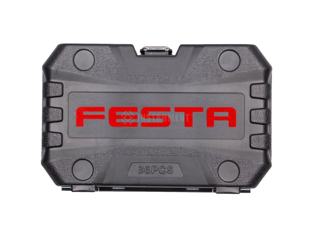 Gola sada 36ks 1/4" Festa CrV. Kvalitná gola sada je vhodná vďaka kvalite použitých materiálov a spracovanie v profesionálnej autodielni alebo servisu. 10 rokov záruka. Všetky časti sú vyrobené z vysoko kvalitnej chróm-vanádiovej ocele. Niklová povrchová úprava. Hroty bitov sú zo zliatiny ocele S2. Račne majú jemné delenie 72 zubov, telo račne z CrV ocele, zubový mechanizmus z S2 ocele, ergonomicky tvarovanú rukoväť so zdravotnej nezávadnej gumy. Nový dizajn plastového kufra z primárneho materiálu s kovovými uzávermi a pánty veka.
