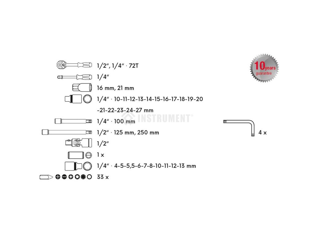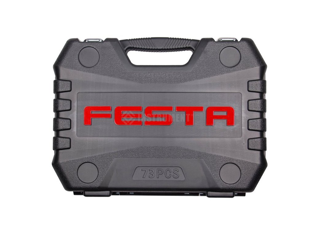 Gola sada 73ks 1/4"+1/2" Festa CrV. Kvalitná gola sada je vhodná vďaka kvalite použitých materiálov a spracovanie v profesionálnej autodielni alebo servisu. 10 rokov záruka. Všetky časti sú vyrobené z vysoko kvalitnej chróm-vanádiovej ocele. Niklová povrchová úprava. Hroty bitov sú zo zliatiny ocele S2. Račne majú jemné delenie 72 zubov, telo račne z CrV ocele, zubový mechanizmus z S2 ocele, ergonomicky tvarovanú rukoväť so zdravotnej nezávadnej gumy. Nový dizajn plastového kufra z primárneho materiálu s kovovými uzávermi a pánty veka.