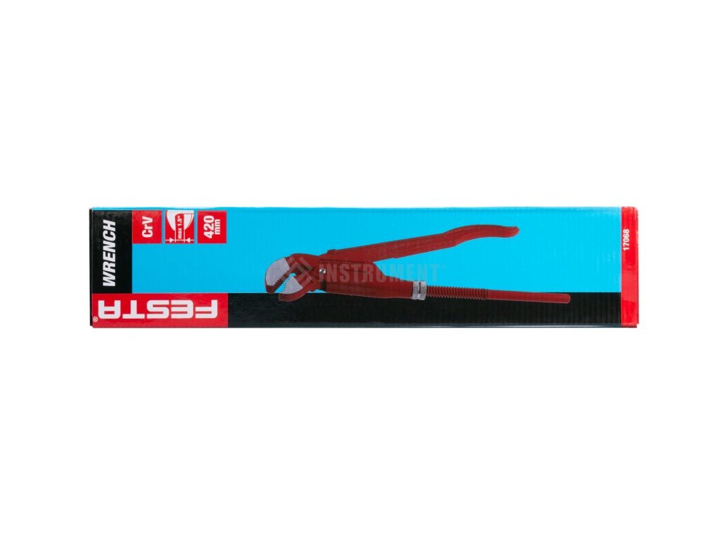 Hasák na rúry FESTA 420 mm 1,5 " , typ S, kovaný hasák z chróm vanádiovej ocele s esovitým tvarom čeľustí, vhodný najmä pre rúrky a oblé materiály, drážkované čeľuste so zubami proti smeru otáčania, rýchle a jednoduché nastavenie rozstupu čeľustí pomocou nastavovacie matice s ochranou proti vyskrutkovanie, max. rozsah čeľustí 55mm.