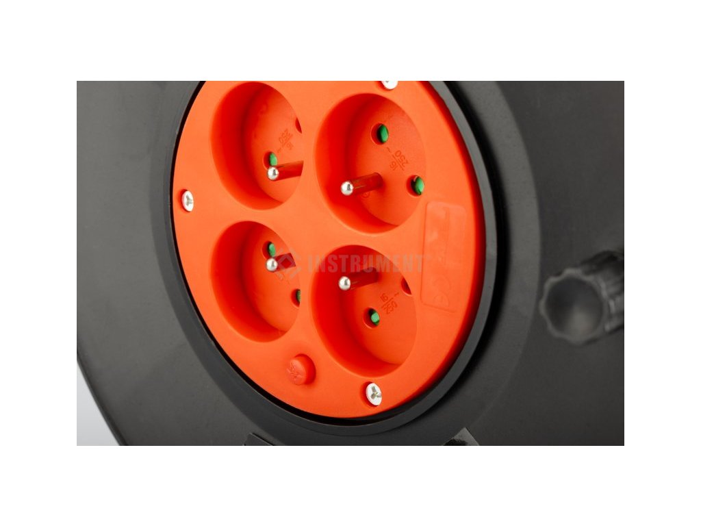 Predlžovací kábel s navijakom so 4 zásuvky. Dĺžka kábla 25m, kábel 3x1,5mm2. Tepelný spínač, zásuvky s detskou poistkou, plnohodnotné zásuvky uložené proti sebe, 16A / 230V, max.1000W navinutý kábel, max.3000W rozvinutý kábel, IP20.