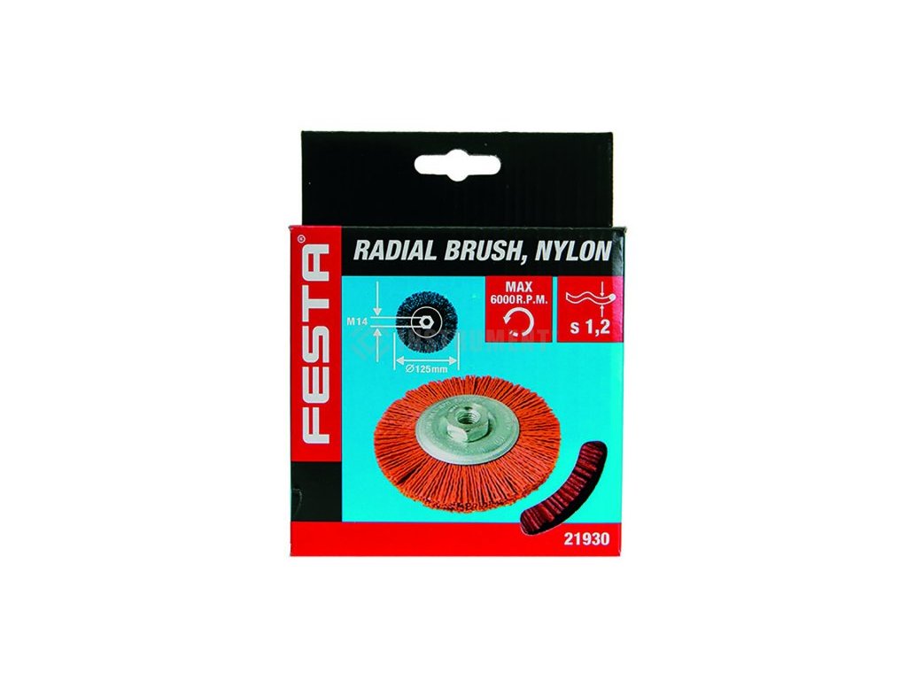 Rotačná kefa - okružná, nylon, priemer 125mm, M14... Kefy FESTA zaručujú kvalitné použité materiály i spracovanie! Použitie: pre leštenie s čistiace práce.