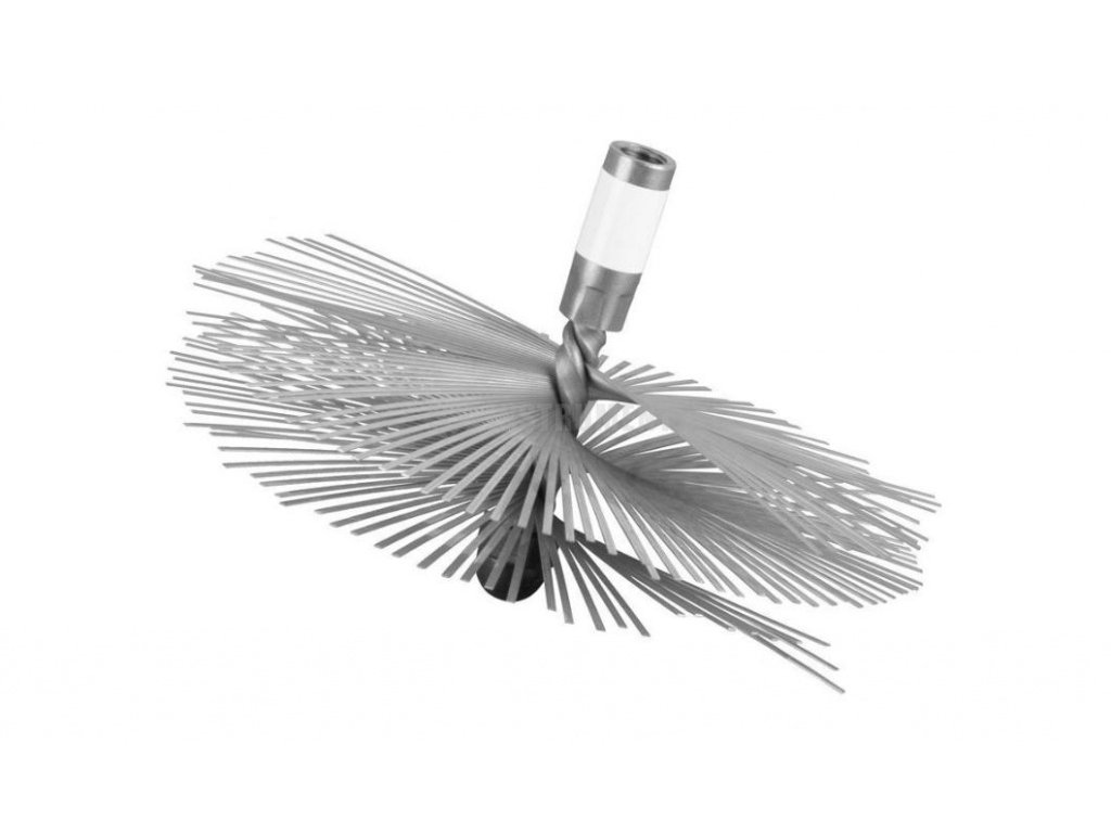 Nerezová štosáková komínová kefa, priemer 200 mm. Kefa je určená na vymetanie nerezových komínových vložiek, ktoré sa kvôli poškriabaniu nemajú vymetať oceľovými komínovými kefami. Kefa má závit M12, možno naskrutkovať na plastovú čistiacu tyč alebo sklolaminátový drôt.