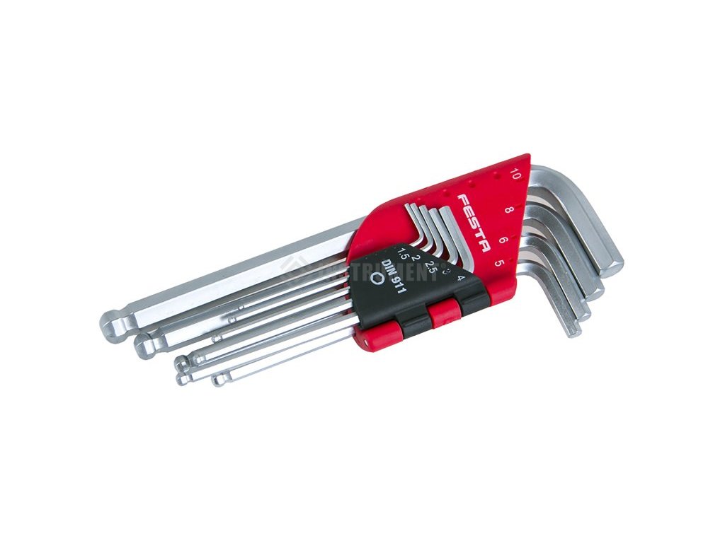 Kľúč imbusový s guličkou 1,5-10mm 9ks sada CrV FESTA. Sada najpoužívanejších rozmerov L šesťhranných kľúčov (imbusů), vyrobených z kvalitnej chróm-vanádiovej ocele, tvrdených v celej dĺžke, štandardná dĺžka v praktickom zatváracím puzdre.