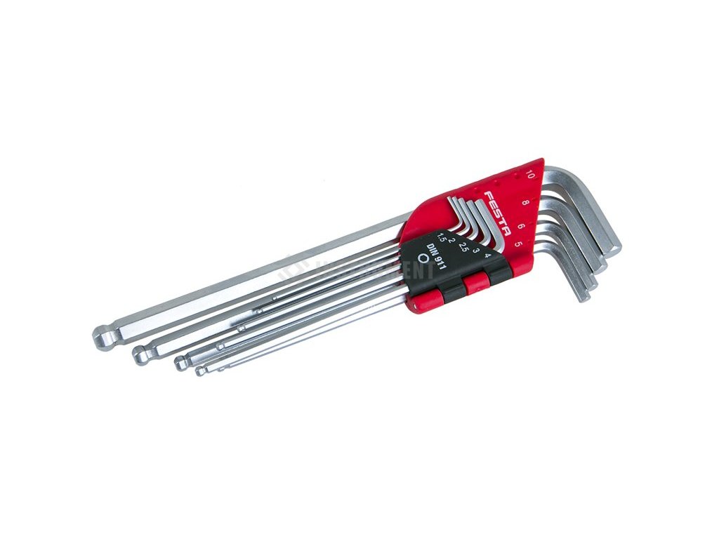 Kľúč imbusový s guličkou 1,5-10mm 9ks sada predľžené CrV FESTA. Sada najpoužívanejších rozmerov L šesťhranných kľúčov (imbusů), vyrobených z kvalitnej chróm-vanádiovej ocele, tvrdených v celej dĺžke, štandardná dĺžka v praktickom zatváracím puzdre.