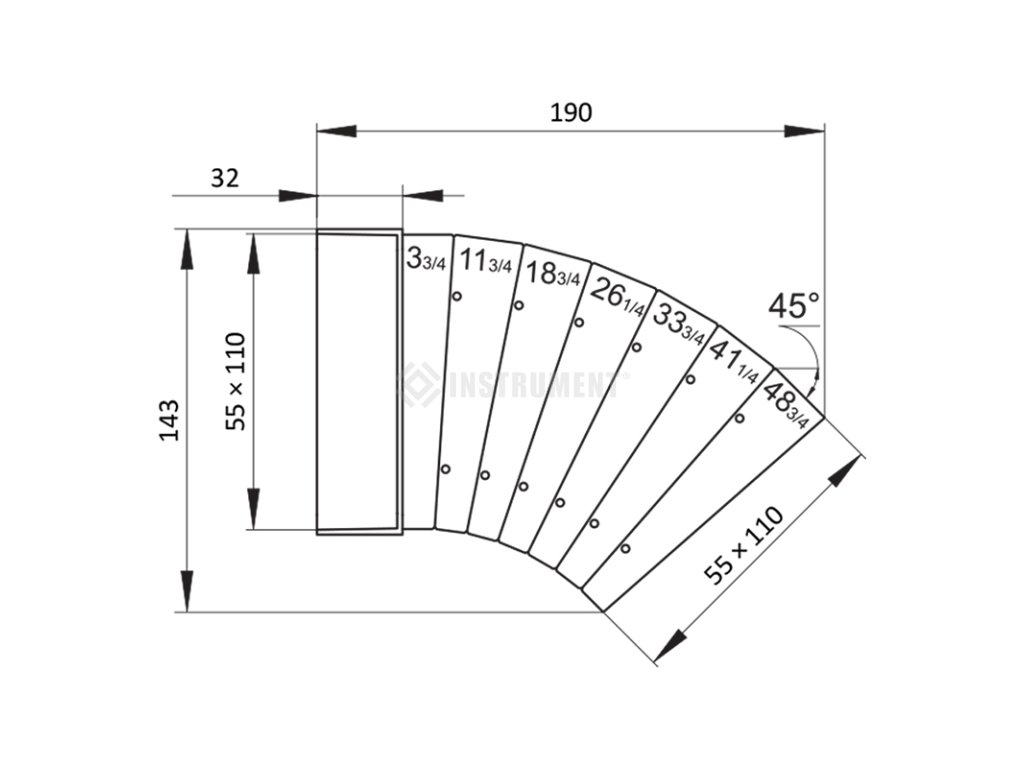 koleno plastové ploché, oblúk viac uhlový horizontálny 55x110mm