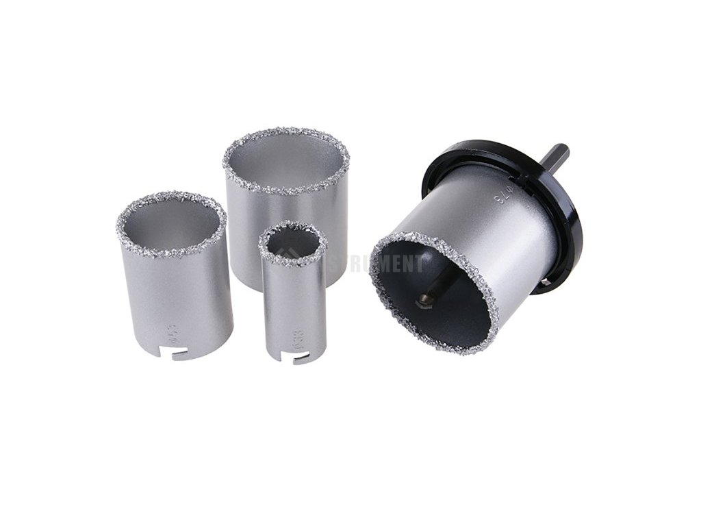 Korunky 33, 53, 67, 73mm s karbidovým ostrím pre čisté a presné vŕtanie keramických obkladov a dlaždíc; Univerzálny unášač pre korunkové vrtáky; Špeciálny vodiaci vrták.