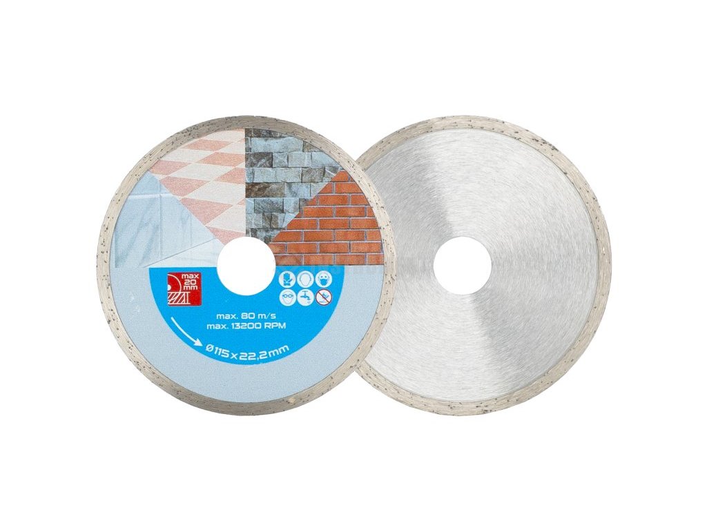 Diamantový kotúč DIAMANT 115mm plný, určený pre mokré rezanie dlažby a obkladov, betónu, tehál, muriva, žuly, mramoru, kameňa, skla, keramiky, kvalitné diamantová vrstva s vysokým obsahom diamantového prachu, kvalitne spracované napojenie na nosný disk kotúče, priemer otvoru 22,2mm . Súčasťou balenia je redukčný krúžok z 22,2 na 20 mm.