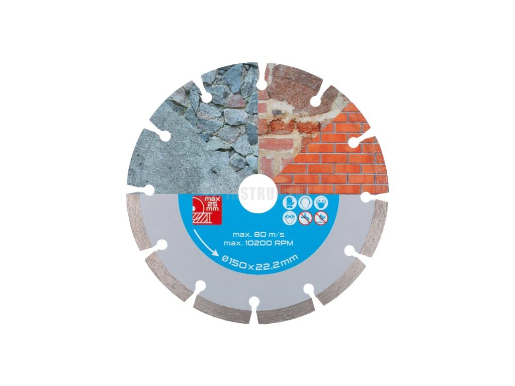 Diamantový segmentový kotúč DIAMANT 150mm, určený pre suché rezanie betónu, tehál, muriva, kameňa, vysoko pevné uchytenie diamantových segmentov k nosnému disku kotúča, vysoký obsah diamantového prachu, priemer otvoru 22,2 mm. Súčasťou balenia je redukčný krúžok z 22,2 na 20 mm.