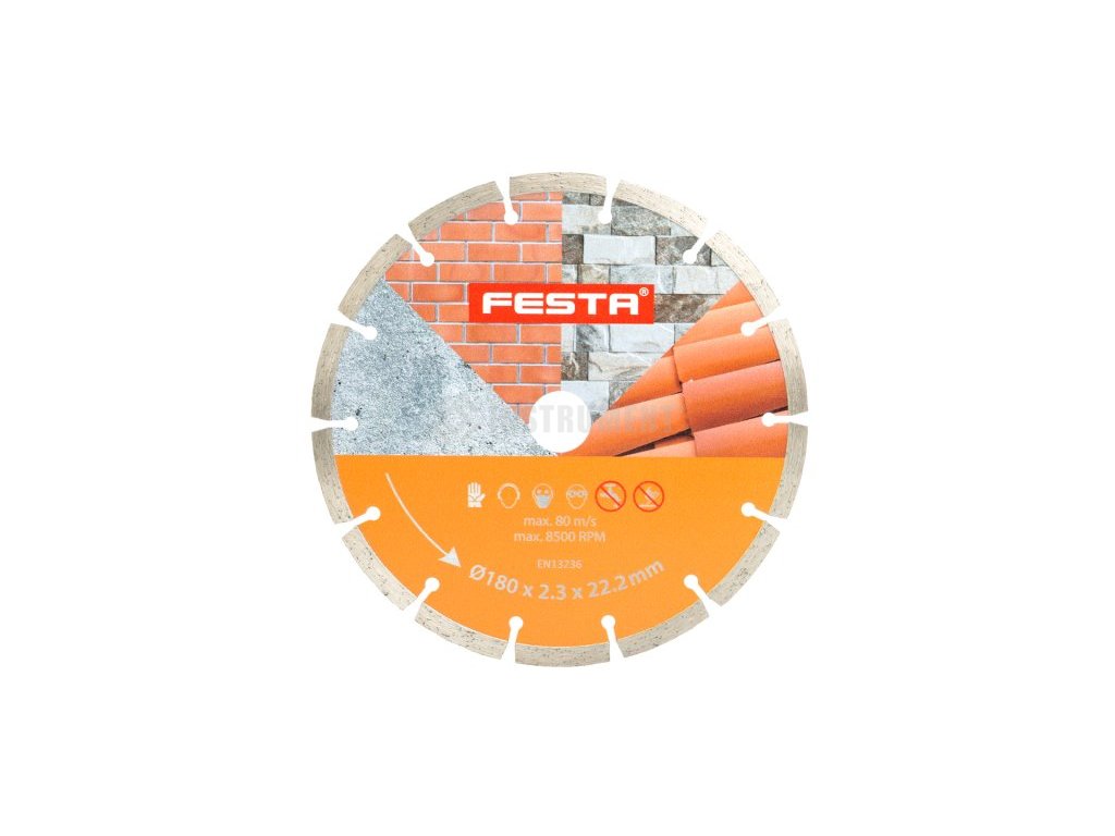 Diamantový segmentový kotúč FESTA 180mm, určený pre suché rezanie betónu, tehál, muriva, kameňa, vysoko pevné uchytenie diamantových segmentov k nosnému disku kotúča, vysoký obsah diamantového prachu, priemer otvoru 22,2 mm