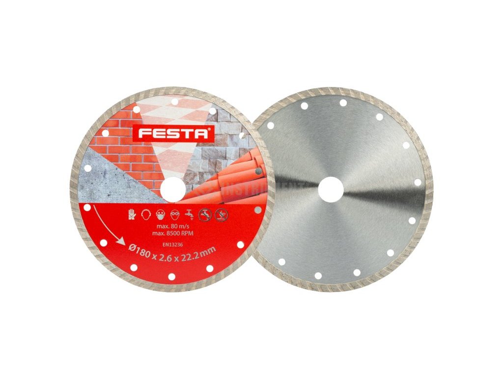 Diamantový kotúč FESTA TURBO 180mm, určený pre suché rezanie betónu, tehál, muriva, kameňa, vysoko efektívne rezanie a rýchle vďaka špeciálnej konštrukcii pevne uchytených diamantových segmentov k nosnému disku kotúča, vysoký obsah diamantového prachu, priemer otvoru 22,2 mm