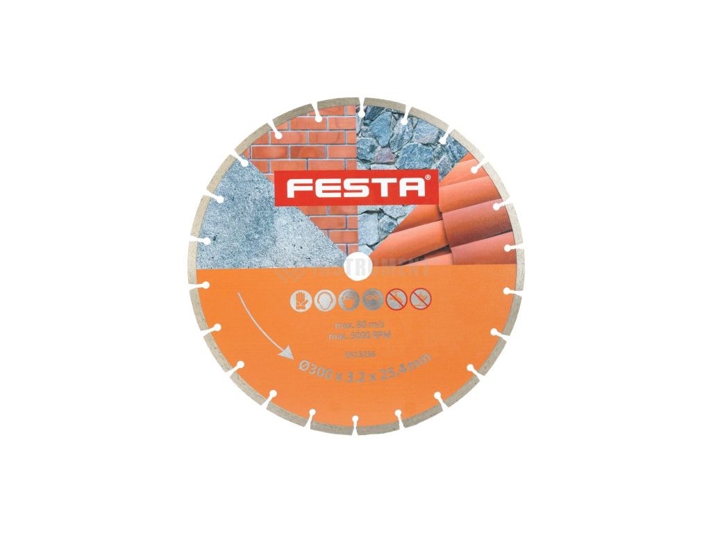 Diamantový segmentový kotúč FESTA 300mm, určený pre suché rezanie betónu, tehál, muriva, kameňa, vysoko pevné uchytenie diamantových segmentov k nosnému disku kotúča, vysoký obsah diamantového prachu, priemer otvoru 25,4 mm