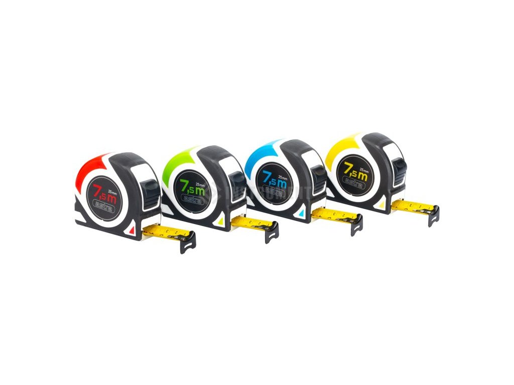 Zvinovací meter 7,5mx25mm, kalená páska, dobre čitateľná stupnica, dve brzdy, pútko, klip na opasok.
