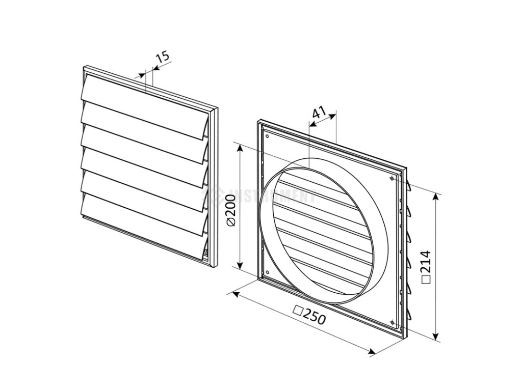 Štvorhranná gravitačná plastová žalúzia s nadstavcom Ø200 mm, 250 x 250 mm.