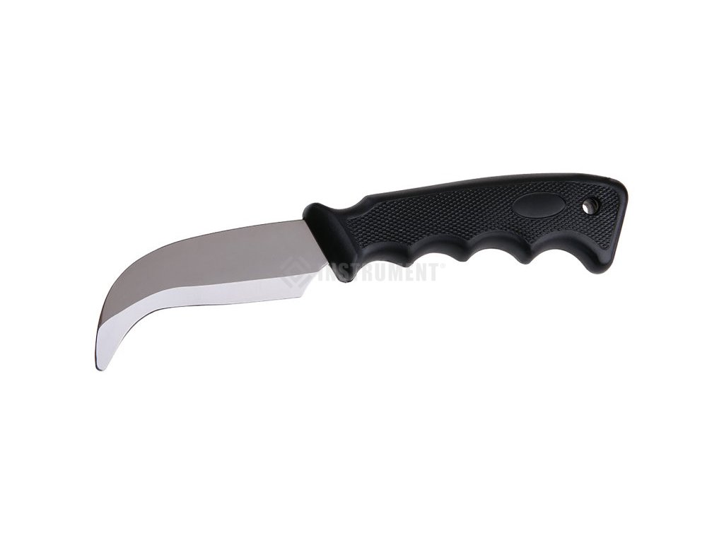 Nôž so zahnutým ostrím, určené na rezanie podlahových a strešných krytín, izoláciou atď, ostrie zalončeno zaoblenou tupou špičkou, plastová ergonomická rukoväť, blister.