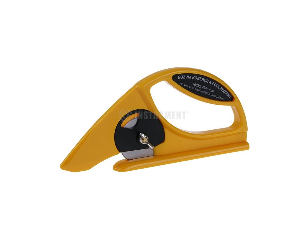 Plastový nôž s kruhovou čepeľou, vhodný najmä na podlahoviny, látky, štiepiace sa materiály.