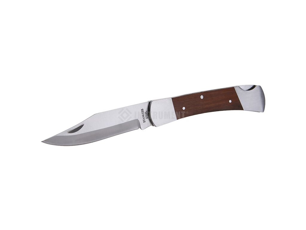 Vreckový zatvárací nôž s poistkou proti samovoľnému zatvoreniu čepele, čepeľ z nerezovej ocele, drevená rukoväť, kvalitné nitovanie, dĺžka čepele 120mm.