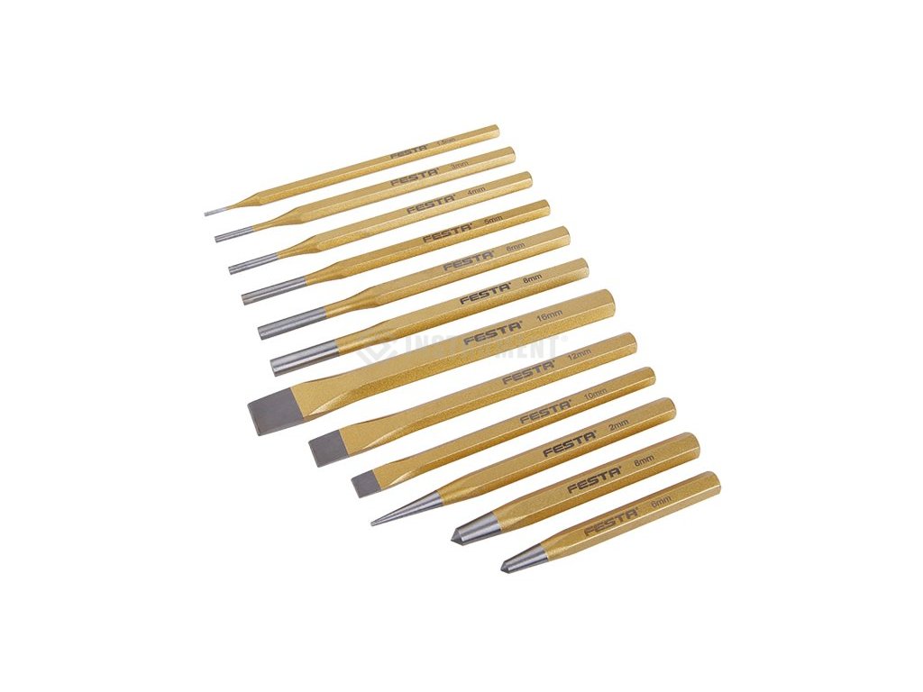 Sada sekáčov, jamkovač a priebojníkov FESTA vyrobená z chróm vanádiovej ocele. Sada obsahuje 12 ks jamkáre: 2, 6, 8 mm, sekáč: 16, 12, 10 mm, priebojník: 1-5-3-4, 4-6-8 mm.