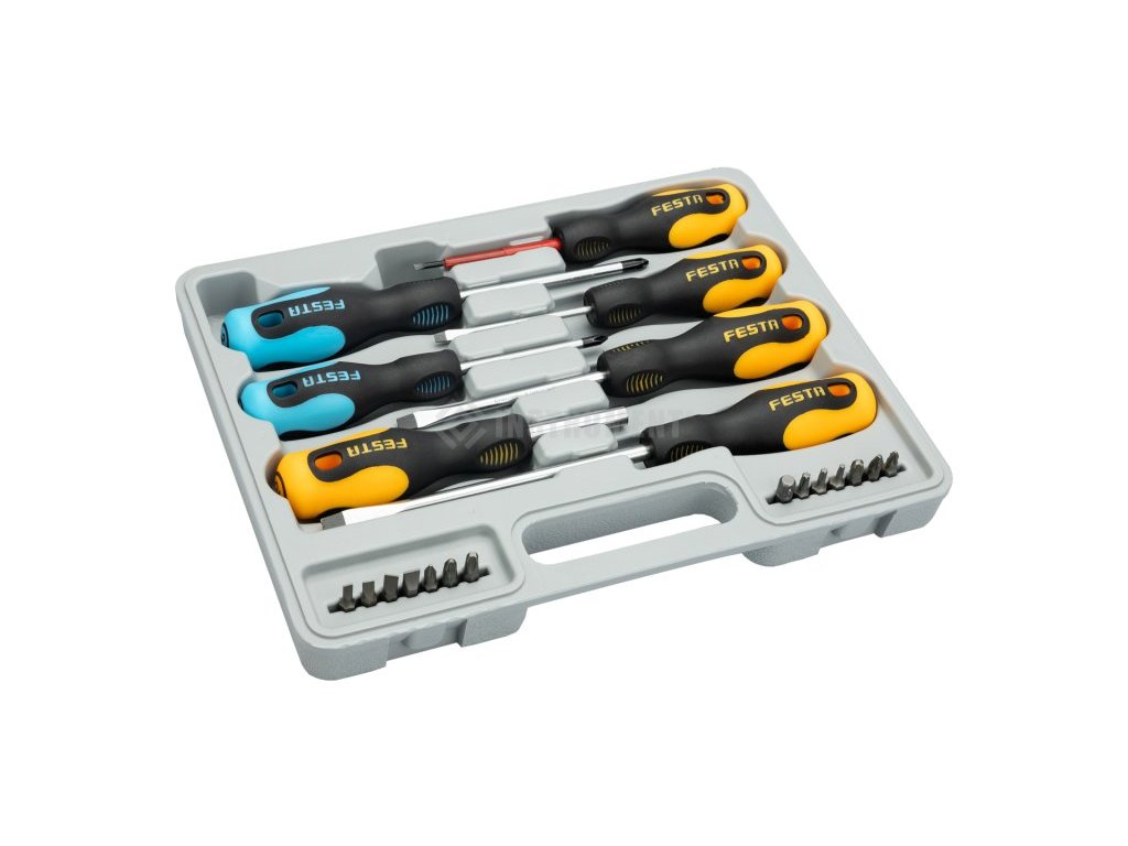 Sada skrutkovačov a bitov 21 ks. Sada obsahuje 21 ks: 4x plochý skrutkovač, 2x krížový skrutkovač, 1x skrutkovač s bitmi, 14x bity. Najvyššia kvalita materiálov a spracovania. Všetky diely vyrobené z chromvandadium ocele.