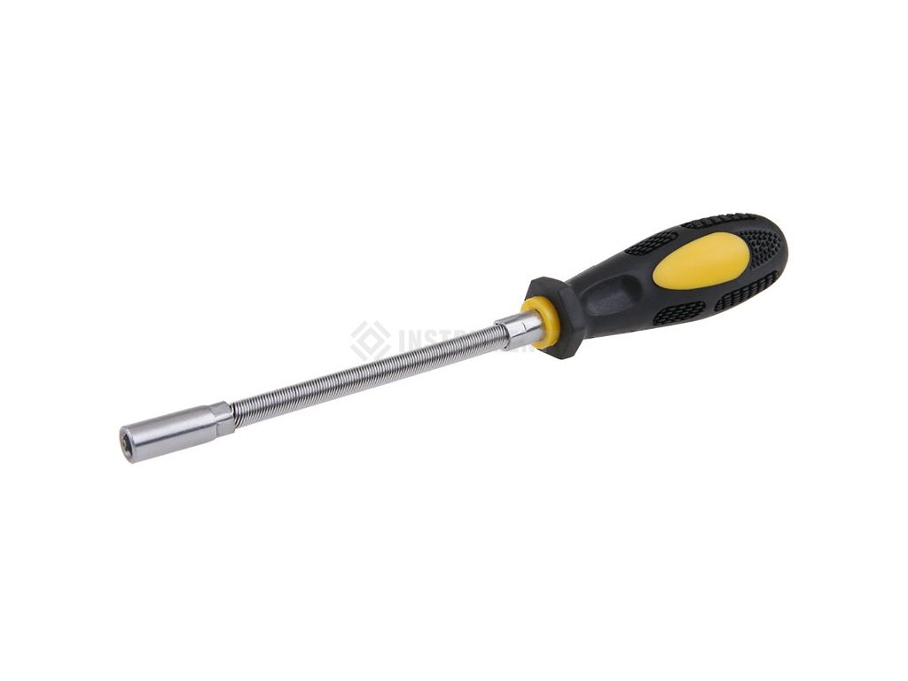 Flexi nástrčný skrutkovač 1/4" má kovový driek so špirálovým pružným predĺžením vyrobený z veľmi kvalitnej chromvanadiové ocele, povrchovo chránený tvrdochrómom, kombinácia polypropylénu a gumy na ergonomicky tvarované rukoväte zaručuje výborné antišmykové vlastnosti a dobrú odolnosť voči mazadlám a chemikáliám.