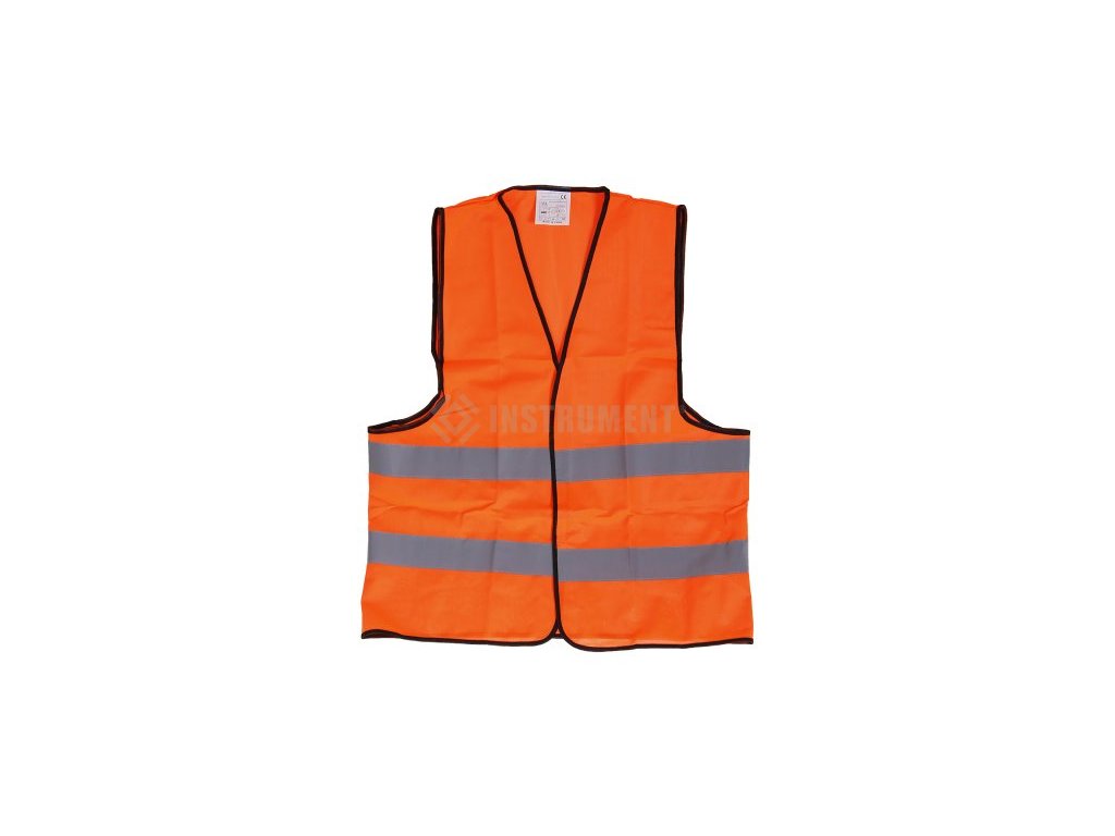 Oranžová polyesterová výstražná vesta, 2 horizontálne reflexné pruhy, zapínanie na suchý zips, veľkosť UNI, CE EN 471.