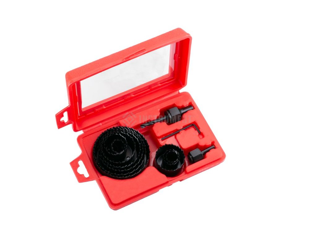 Sada vykružovákov do dreva a sadrokartónu, sada 12 ks, priemer: 19, 22, 25.5, 36, 44, 51, 60, 67, 82 mm + imbus + 2x hlavička, do dreva a sadrokartónu.