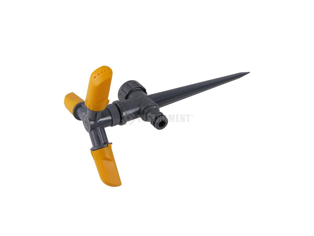 Zavlažovač hrotový rotačný - 3 ramená. Veľmi kvalitný rotačný zavlažovač s pripojením hadicovou rýchlospojkou pre Vašu záhradu. Vyrobené z kvalitného plastu. Farba žltosivá. Min.70 kPa a max.550 kPa.