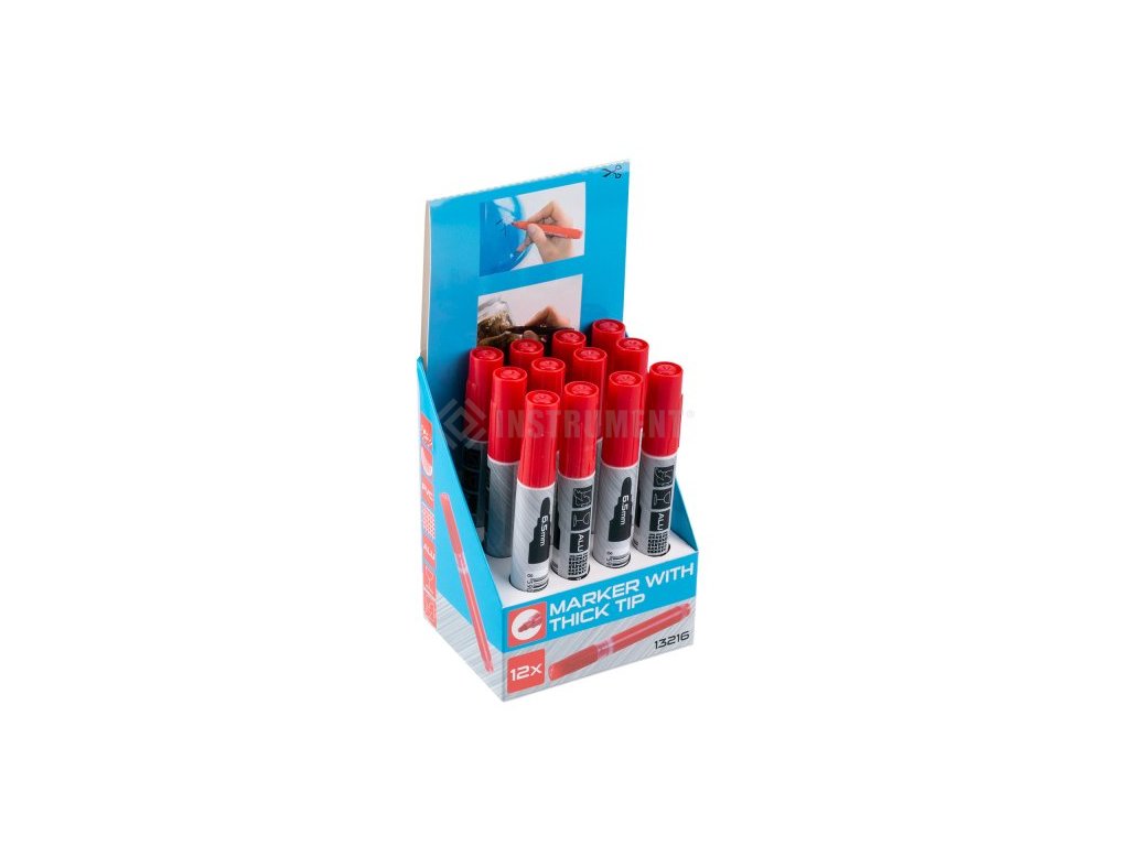 Špeciálny značkovač - fix s hrubým hrotom 4 - 6,5 mm - červený, popisy železných konštrukcií, skla, plastov, čiernych strečových fólií atď .. K prefarbenie hrotu je potreba značkovač pretrepať - guľôčky vnútri premieša farbu a stlačením hrotu dovnútra dôjde k nasatie farby a značkovač - fix je pripravený na použitie.